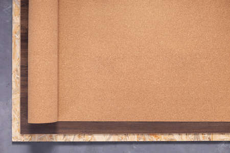 Cork roll and laminate floor on concrete background texture. Cork background at wooden laminate floor and chipboard