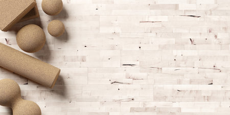 Fascia or trigger point massage cork tools, fascia or yoga roll, peanut, balls and blocks over light brown wooden floor background with copy space, 3D illustration