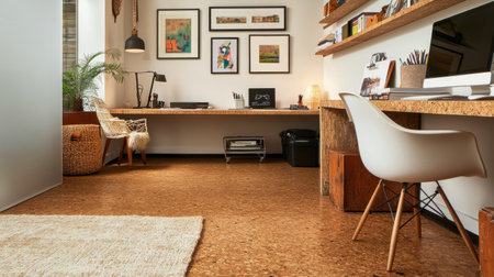 This cozy workspace showcases natural cork flooring paired with stylish furniture, creating an inviting area ideal for work or study. Shelves hold decorative items and necessary supplies.