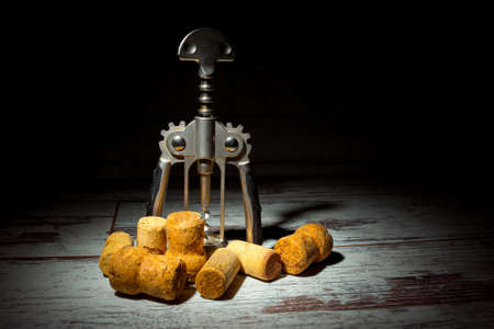 Corkscrew and corks from wine bottles on a wooden table. Close-up, selective focus.