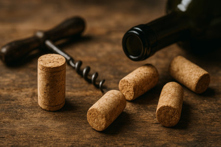 Corks, a corkscrew, a glass of red wine, and a bottle are carefully arranged on a light wooden table, perfect for a tasting event.