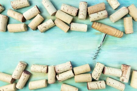 Wine corks with vintage corkscrew and bottle of white wine on wooden table background.