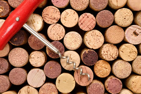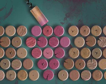 flat lay of many wine corks and corkscew, wine treat and drink mock up