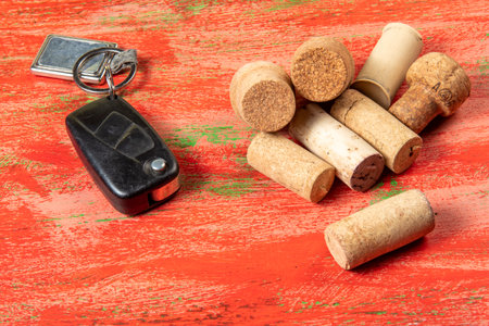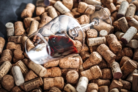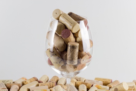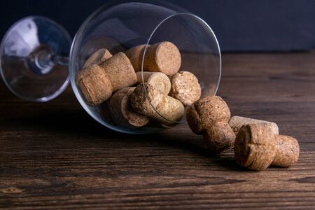 Large decorative glass tumbler, wine glass on a long stem, beautiful filled with wine corks lies on a wooden table. Corks are strewn nearby.