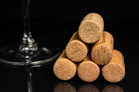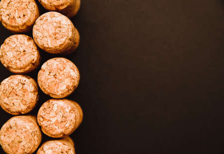 Corks from bottles of wine or champagne on a black background. Traffic jams stand in dense rows.Background and texture. Empty space for the text. Alcoholic beverages.