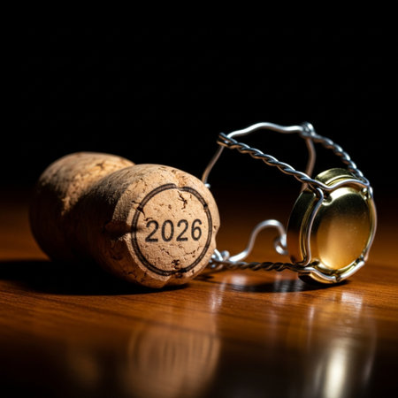 Champagne corks showcased in close-up on a black background, capturing the essence of party moments, Christmas, and New Year's Eve festivities.