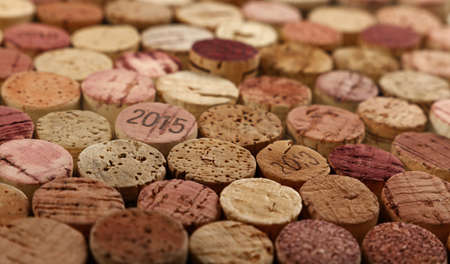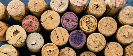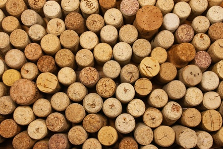 Wine cork stoppers background, top view, close up. Winery or wine tasting concept.