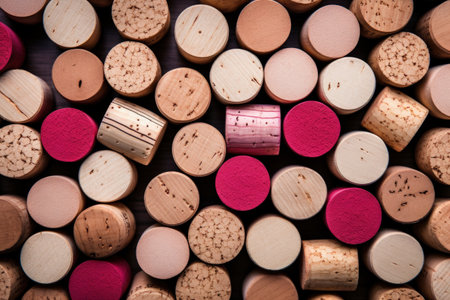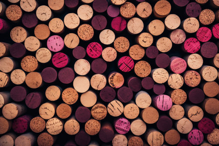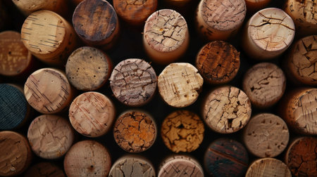Cork stoppers arranged in visually appealing pattern showcase various textures and colors, highlighting natural beauty of wood. This evokes sense of craftsmanship and organic materials