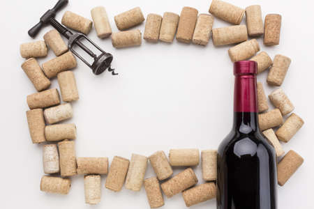 Wine corks with vintage corkscrew and bottle of white wine on wooden table background.