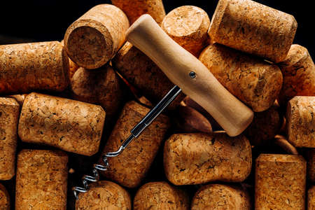 Corkscrew and corks from wine bottles on a wooden table. Close-up, selective focus.