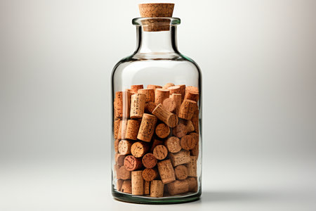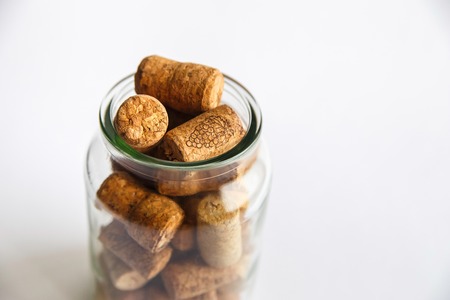 Wine corks lie in a glass jar on a white background. The bank is located on the left side