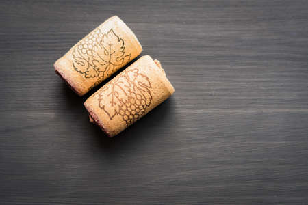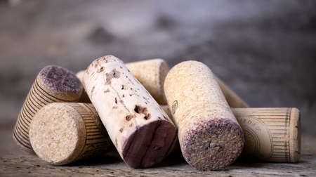 Wine corks lying on a wooden table. Vintage style, toned image. Selective focus. Copy space background