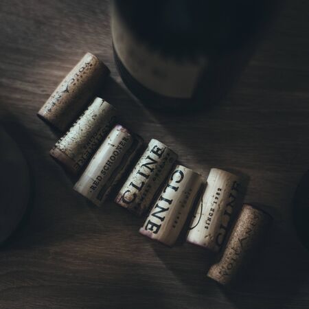 SAINT PETERSBURG, RUSSIAN FEDERATION - AUG 16 2018: corks from just opened bottles of wine Cline Family Cellars.