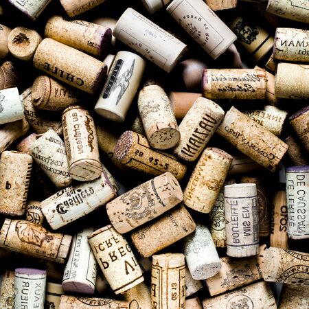 Odessa / Ukraine - 05 28 2020: Selective focus to wine corks texture. Pile of various wine bottle corks for winery concept background