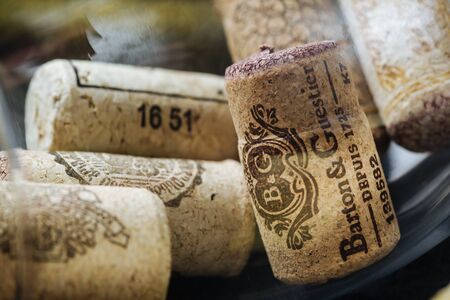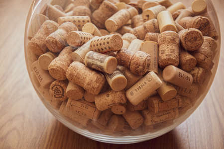 Bucharest, Romania, 27 March 2021: Bowl full of many used wine corks from a variety of wineries