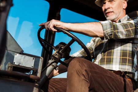 Whats a farmer without his tractor. Shot of a mature man driving a tractor on a farm.