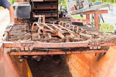 A large iron excavator bucket collects and pours sand rubble and stones in a quarry at the construction site of road facilities and houses