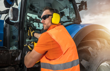 A worker in safety gear uses a tractor in the field during late afternoon. The task focuses on farm activities.
