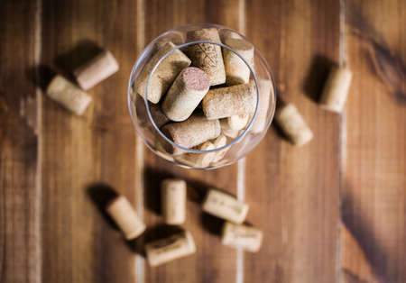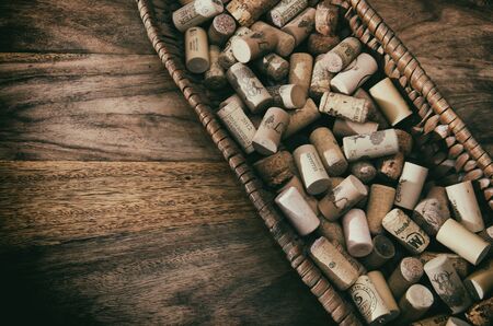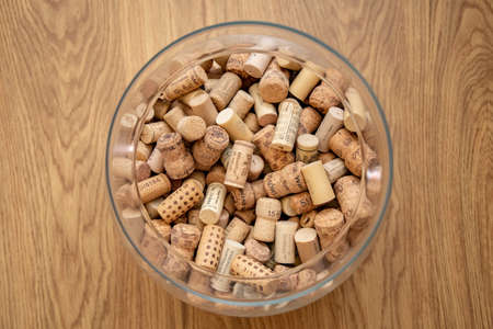 Odessa / Ukraine - 05 28 2020: Top view of round glass vase full with many used wine corks on wooden background. Pile of various wine bottle stoppers for winery concept background
