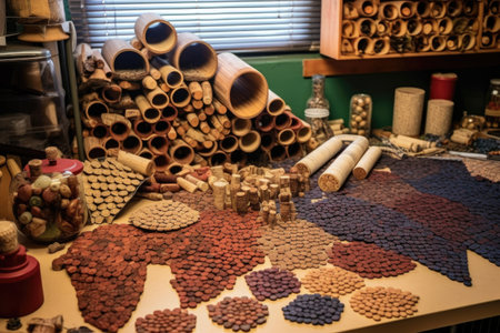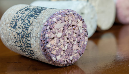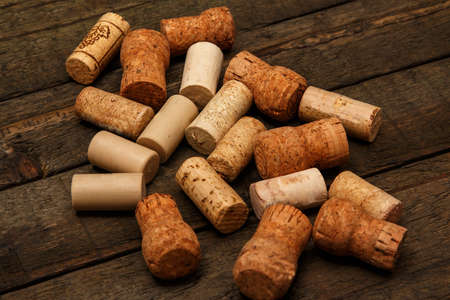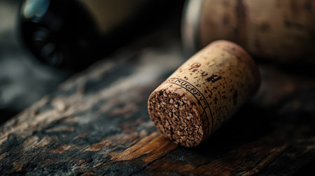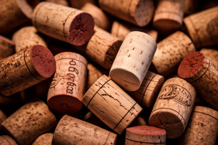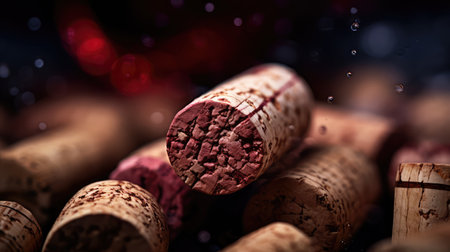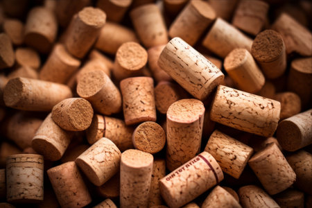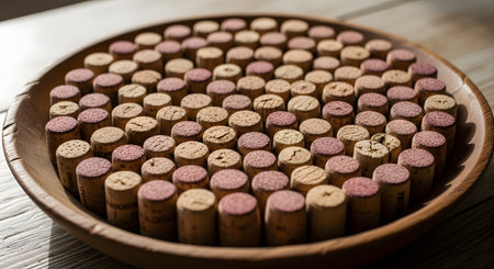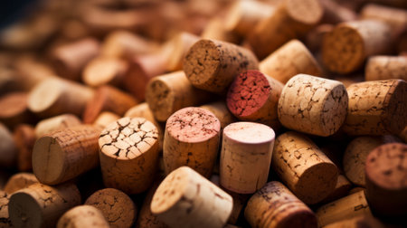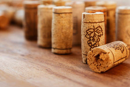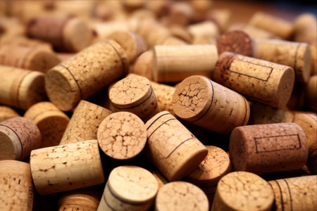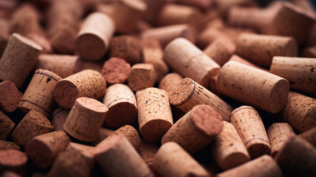 A close-up of wine corks on a wooden table, showing the intricate details and natural beauty of the winemaking process.