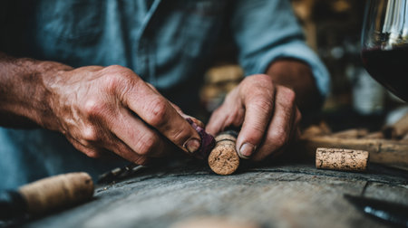Skilled worker at an artisan winery sealing a bottle with a cork, surrounded by vintage crafting tools and a warm atmosphere.