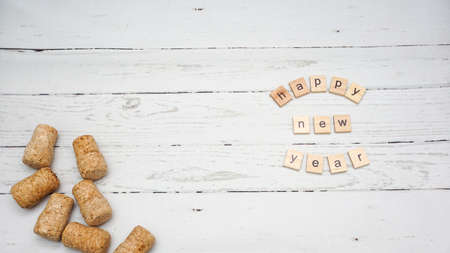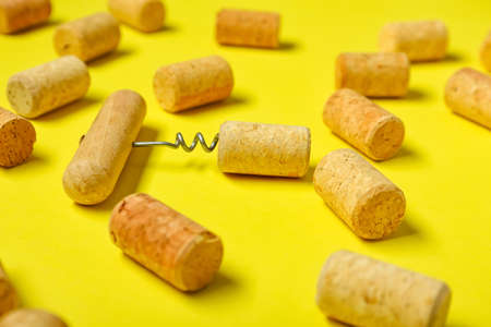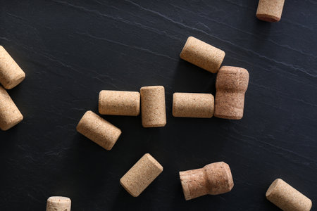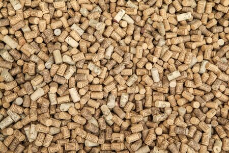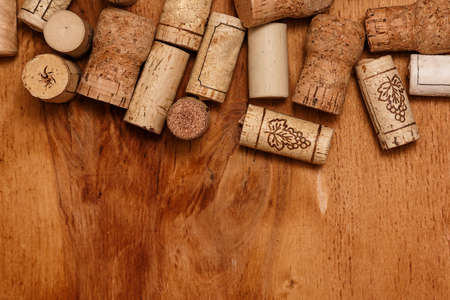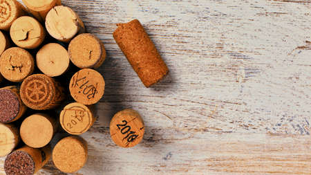 Wine cork stoppers background, top view, close up. Winery or wine tasting concept.