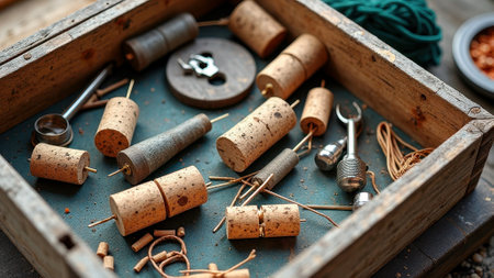 Rustic fishing tackle box with cork bobbers and hooks. That the image is generated using AI.