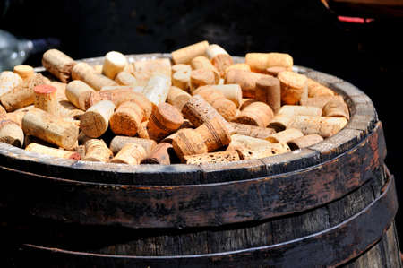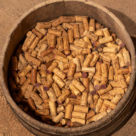 Monthelie, France - June 30, 2020: Corks in a barrel at domaine Boussy, Monthalie, burgundy, France.