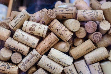Moscow, Russia-August 28, 2019: wine corks of various manufacturers. Wine houses of France, Italy, Spain, Russia, Georgia and others