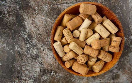 Bucharest, Romania, 27 March 2021: Bowl full of many used wine corks from a variety of wineries