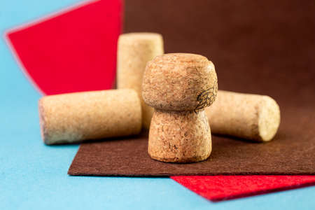 Used wine corks on sackcloth background with empty space for text. Colorful corks from white and red wine bottles