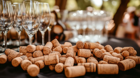 A beautiful arrangement of wine corks scattered on a table surrounded by elegant glasses, creating a warm, inviting atmosphere for outdoor gatherings.