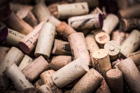 Many wine corks standing on edge. Close up, shallow depth of field. Different sizes, colors and shapes.