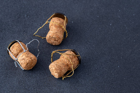 Champagne corks showcased in close-up on a black background, capturing the essence of party moments, Christmas, and New Year's Eve festivities.