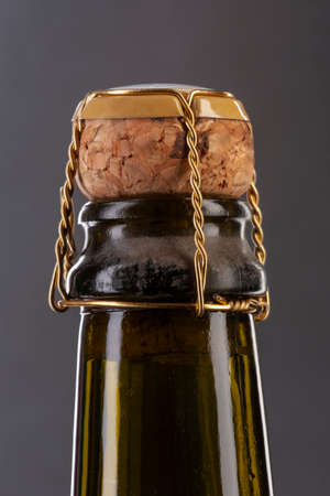 Closeup of champagne bottle and cork. plaque, muzzle. Limited depth of field.