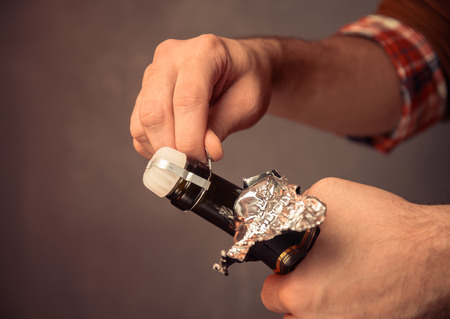 Man's hand opens a bottle of champagne. The man unscrews the champagne muselet. Champagne bottle on a black background