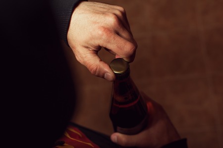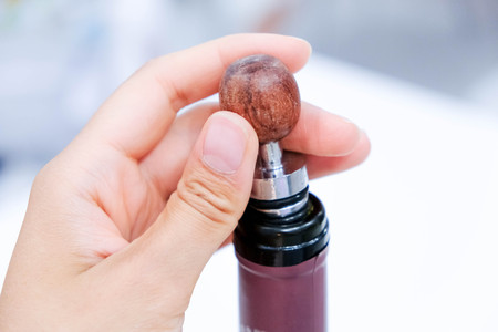 closeup of the hands of a young man uncorking a bottle of red wine with a corkscrew - focus on the mouth of the bottle