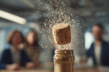 Champagne cork bursts from the bottle, creating a delicate spray of bubbles, capturing the essence of celebration and joy, ideal for festive occasions and special moments