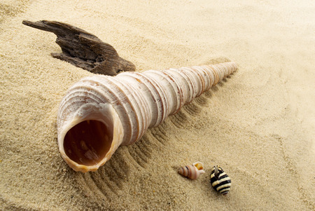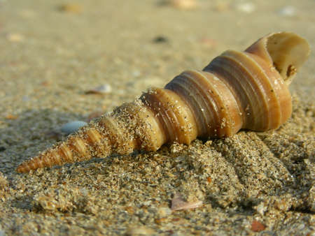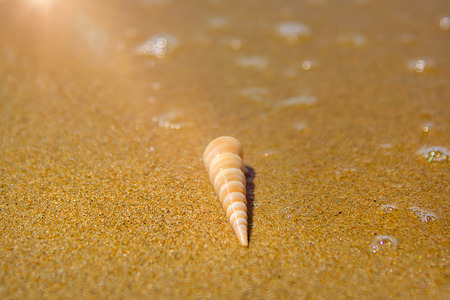 Seashell on the sand beach in the back-light of sunset. Summertime