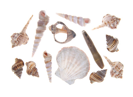 Shells, natural organic color seashell on white background with blank space for text. Travel or vacation concept. Summer background
