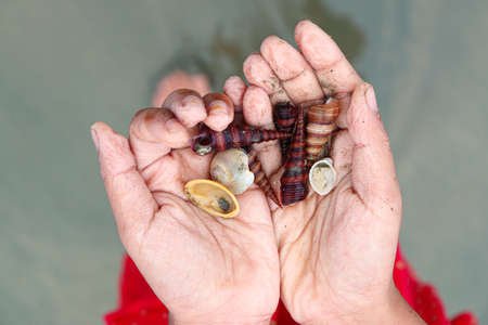 beautiful ornate shell lies on hand, against the backdrop of the turquoise sea, seafood in close-up on the shore. tropics
