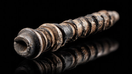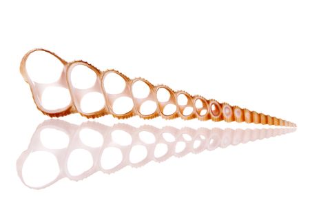 Single snail sea shell of Turritella terebra from the family Turritellidae, isolated on black background, mirror reflection