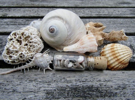 Beautiful seashells, beachworn coral pieces and small glass bottle on wooden background