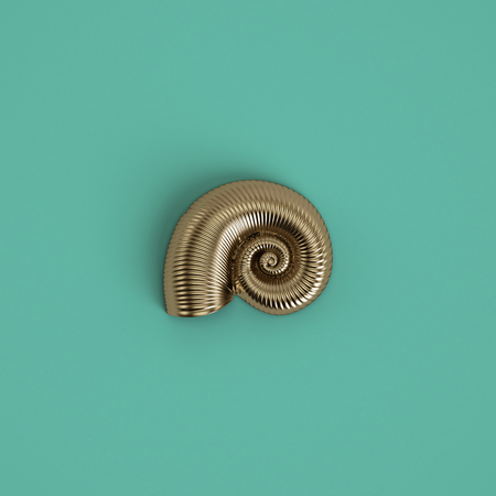 Golden seashell sculpture on pastel green background. Flat lay. Trendy fashion Style. Minimal Design Art. Digital illustration.3d rendering