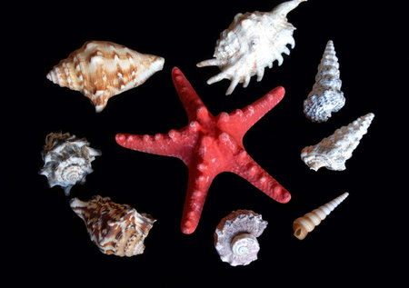 Closeup view of an arrangement of spiny seashells from marine snails or gastropods on sand viewed from above