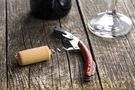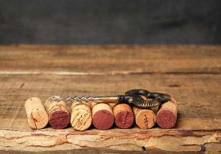 Autumn is the time for winemaking. Composition with a wine bottle stopper and a corkscrew on a wooden background.