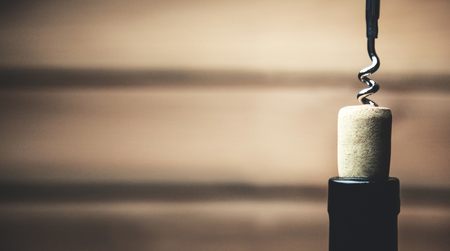 Closeup of a corkscrew inside a wine cork in a bottle. copyspace.