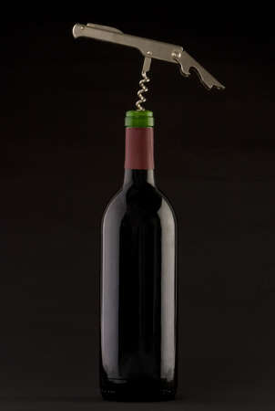Professional sommelier or waiter knife, pulls out a cork from the bottle of red wine. Corkscrew and bottle opener close up macro in dark key.