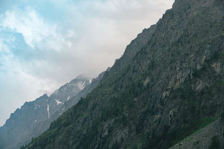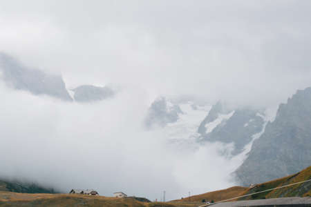 A beautiful shot of foggy and cloudy high rock mountains during winter