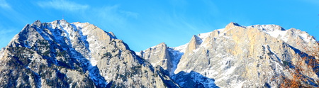 Beautiful scenic view with snow-covered rocks and blue sky, Mayrhofen, Austria